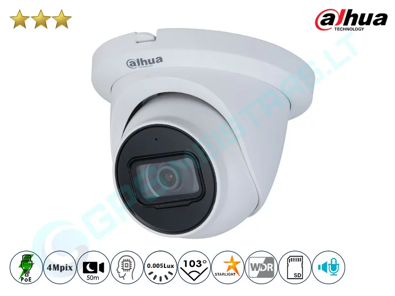 4 MP IP kupolinė vaizdo kamera, fiksuoto židinio nuotolio objektyvu 2,8 mm, IR pašvietimas iki 50 m.